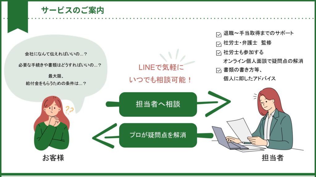 給付金サポートの分野では、個人の状況や退職理由によって対応が大きく異なるため、経験豊富な専門チームがいることが重要です。